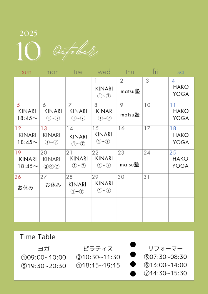 こんにちは。 いつもKINARIご利用ありがとうございます😊 お待たせ致しました。 10月スケジュールのご案内をお送りさせていただきます。 日曜日のピラティスは、 ■10/5㈰18:45~19:45 ■10/12㈰18:45~19:45 ■10/19㈰18:45~19:45 ※10月27日㈪お休み。 朝と夜は随分と涼しく、過ごしやすくなってきましたね。 季節の変わり目は、体調も変化しやすいと思います。体と心整えていきましょう。 10月もどうぞよろしくお願い致します😊 ✻✻✻✻✻✻✻✻✻✻✻✻✻✻ 体験レッスン随時募集中。 LINEお友達登録はコチラ https://lin.ee/vlIIn4O ライン限定のお得な情報や耳寄りな情報をお届けいたします。 KINARIでは安定して安心できる身体作りをお手伝いいたします。 一緒に楽しく動いていきましょう。 |