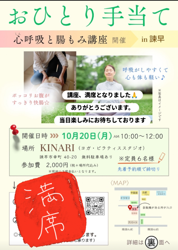 満席となりました! お申し込みありがとうございます。 当日楽しみにお待ちしております😊 心呼吸と腸もみ講座 定員6名 ■日時:10/20㈪10:00~12:00 ■料金2000円 ■内容 ①心と呼吸と腸の関係 「そういうことか!」と心と体の繋がりも知れます。 ②15分セルフケア法 「おひとり手当て」を体験して自分でできる方法を身につける。 ③質疑応答タイム 分からないこともここで解決☆ ■必要なもの ・筆記用具 ・動きやすい格好 ・飲み物 心と体の総合案内所の山本先生をお呼びして開催いたします。 身体に関することを知りたい、学びたいといった一般の参加者さんももちろんセラピストさんやインストラクターさんにもおすすめの講座です。 申し込みはお問い合わせ、またはLINEからも受け付けております。 お名前と参加の旨をお知らせくださいませ。 |