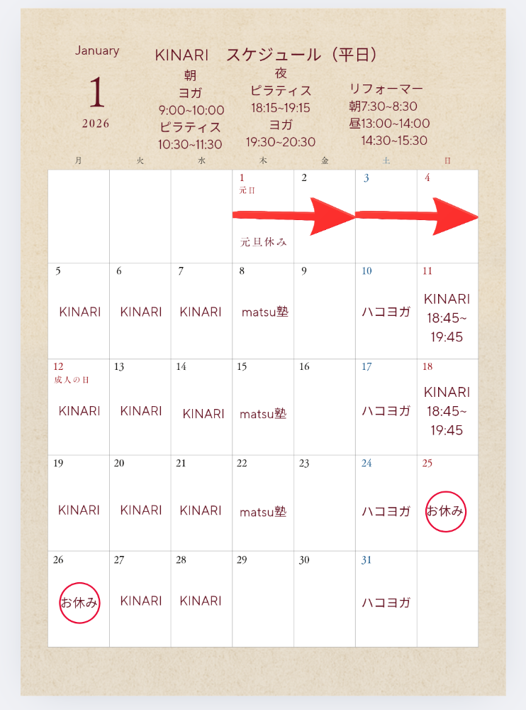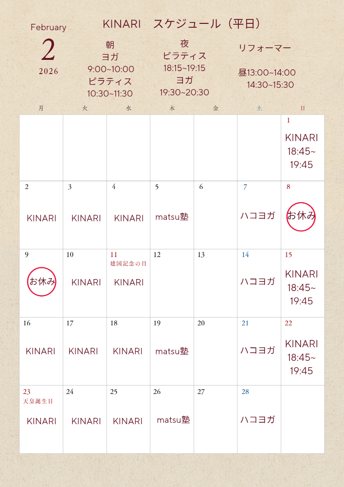 日曜日のピラティスは、 ■2/1㈰18:45~19:45 ■2/15㈰18:45~19:45 ■2/22㈰18:45~19:45 ※2月8日㈰、9日㈪お休み。 ご予約、お問い合わせは LINEからも受け付けております⭕️ ※LINEでの対応は緊急性のある場合を除き営業時間外はお休みとなります。 何卒ご了承くださいませ。 7:00〜より対応させていただきます。 冷え込む日々が続いております。 冷えは万病の元とも言われます。 運動することは冷え対策にもおすすめです。 体と心整えていきましょう。 2月もどうぞよろしくお願い致します😊 ✻✻✻✻✻✻✻✻✻✻✻✻✻✻ 体験レッスン随時募集中。 LINEお友達登録はコチラ https://lin.ee/vlIIn4O ライン限定のお得な情報や耳寄りな情報をお届けいたします。 KINARIでは安定して安心できる身体作りをお手伝いいたします。 一緒に楽しく動いていきましょう。 |